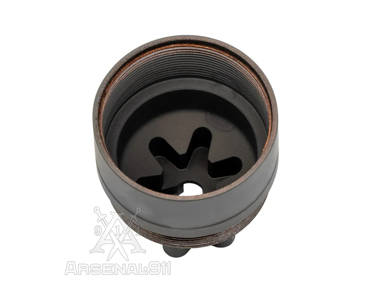 - Благодаря своей форме пламегаситель эффективно рассекает пороховые газы и прячет вспышку выстрела гораздо эффективнее стандартных решений.