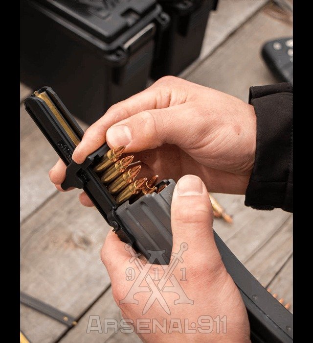 - Назначение: зарядка AR-15 / M4 магазинов калибра 5.56 / .223 из 10-зарядных стрипперов или отдельных патронов.