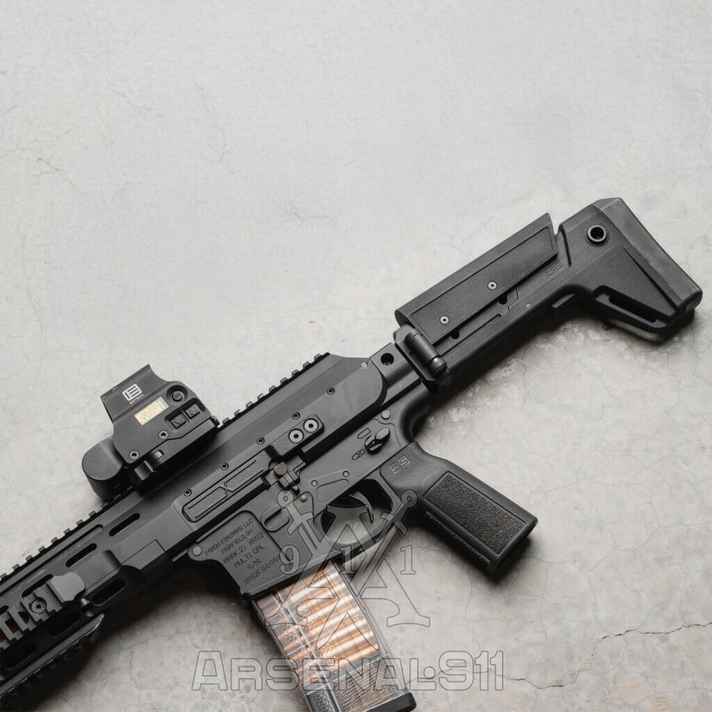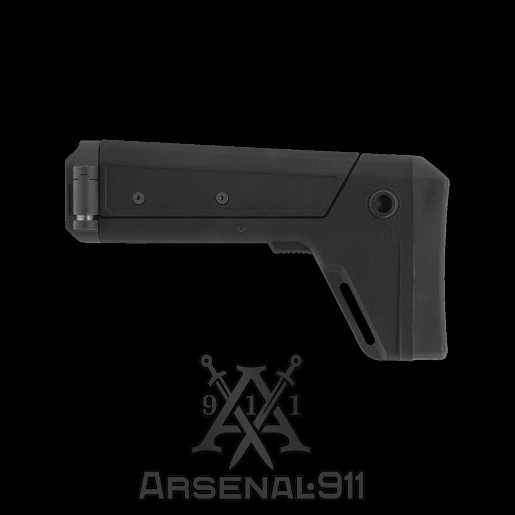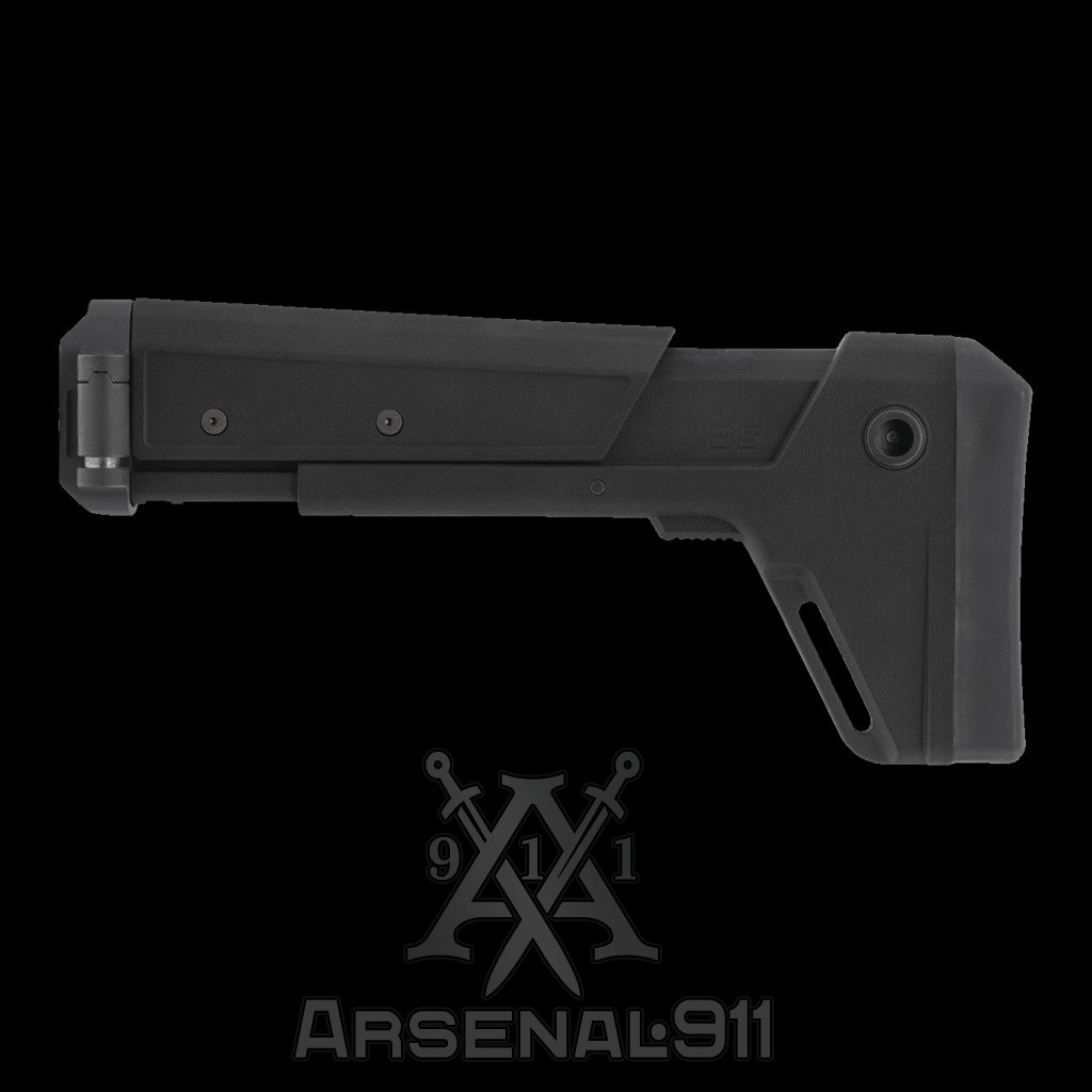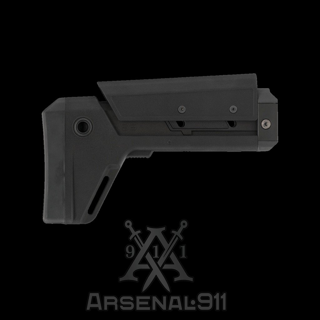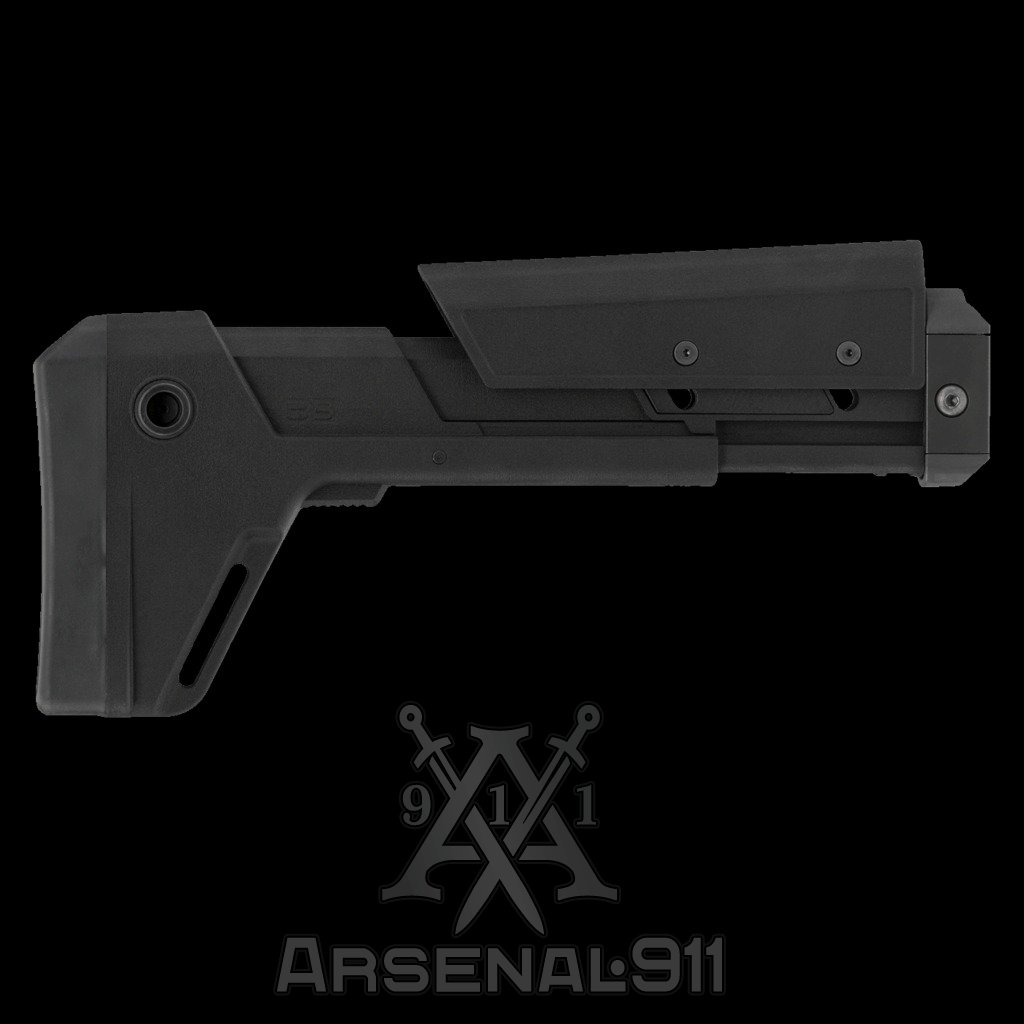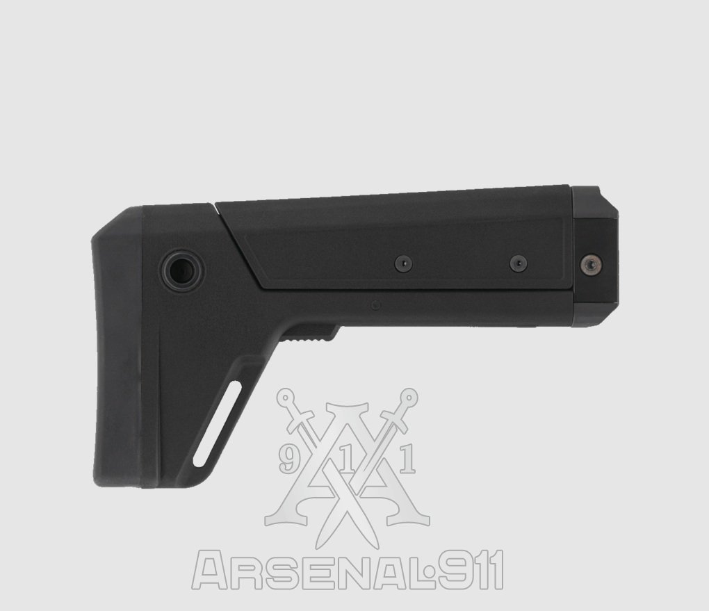B5 Systems Modular Platform Stock — продуманий приклад, що поєднує компактність, налаштовуваність і міцність. Оснащений боковим сталевим шарніром, регульованим упором по довжині, підщічником на пружині та зручними кріпленнями для ременя. Монтаж здійснюється безпосередньо на стандартну 1913 Picatinny-рейку, без адаптерів. Виконаний із довговічного композиту.