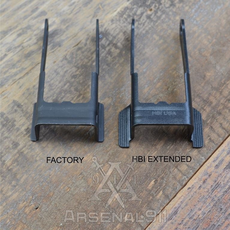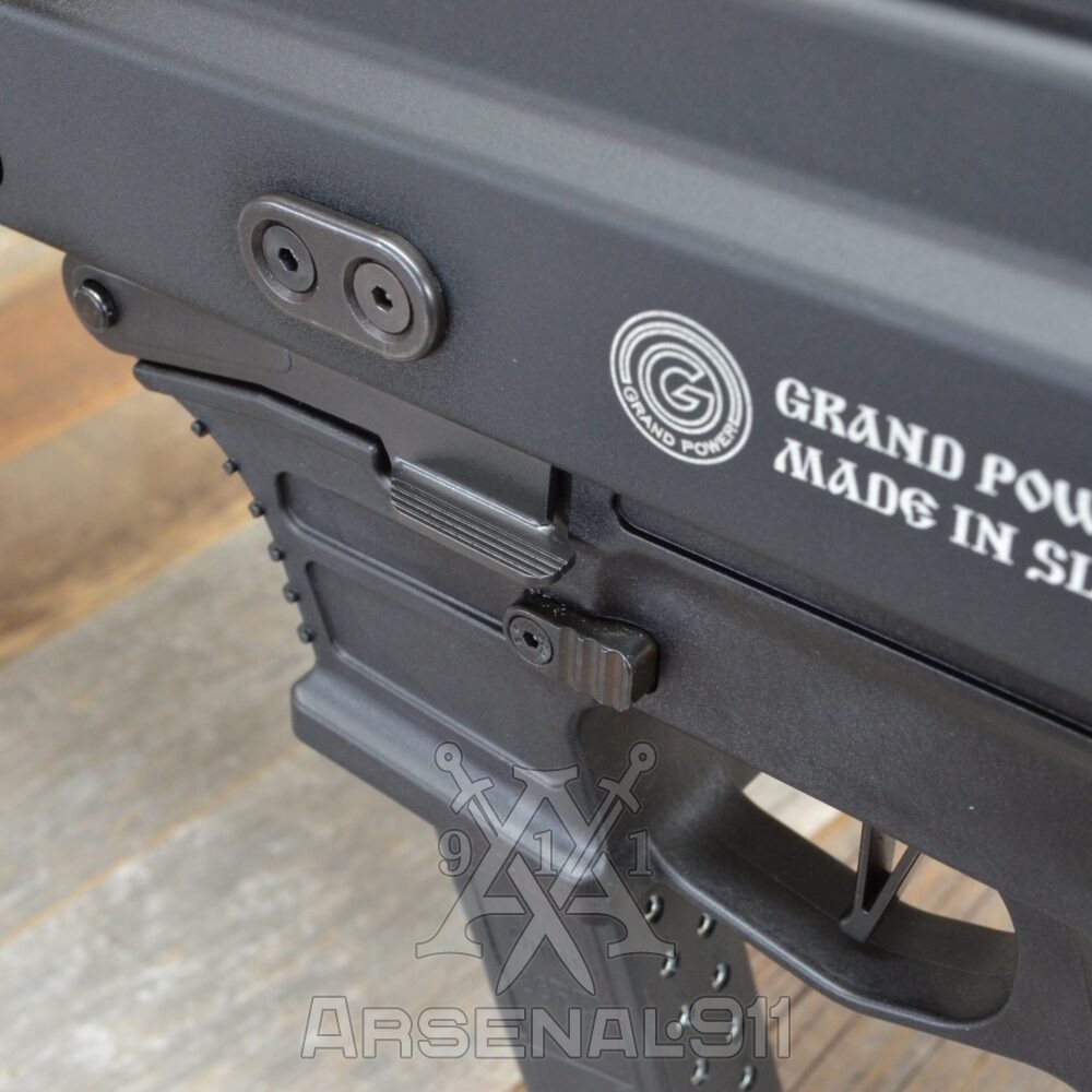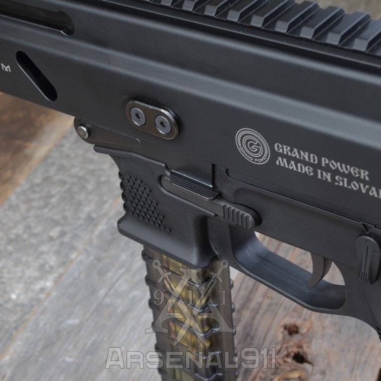 Збільшений важіль скидання затримки затвора Grand Power Stribog SP9A1/A2/A3. Важелі збільшені на 3,5 мм по ширині з кожного боку та подовжені на 4,5 мм у бік спускової скоби. Контактні поверхні з насічками, решта граней заокруглені. Виготовлений з термообробленої сталі 4140 з чорним нітридним покриттям.